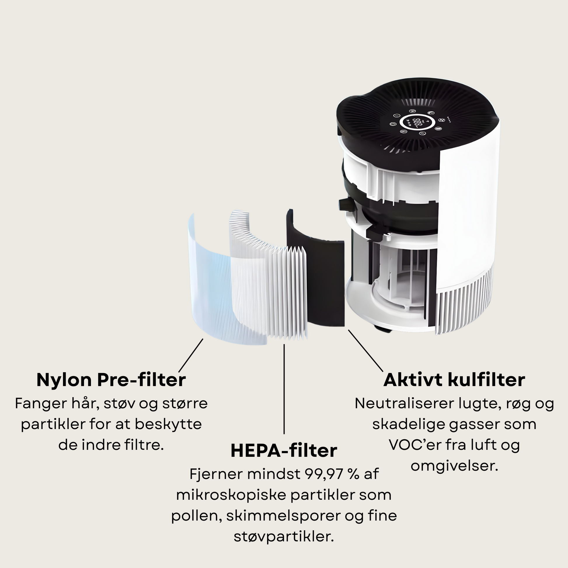 • Filtrerings type: Nylon pre-filter, HEPA H13-filter og aktivt kulfilter